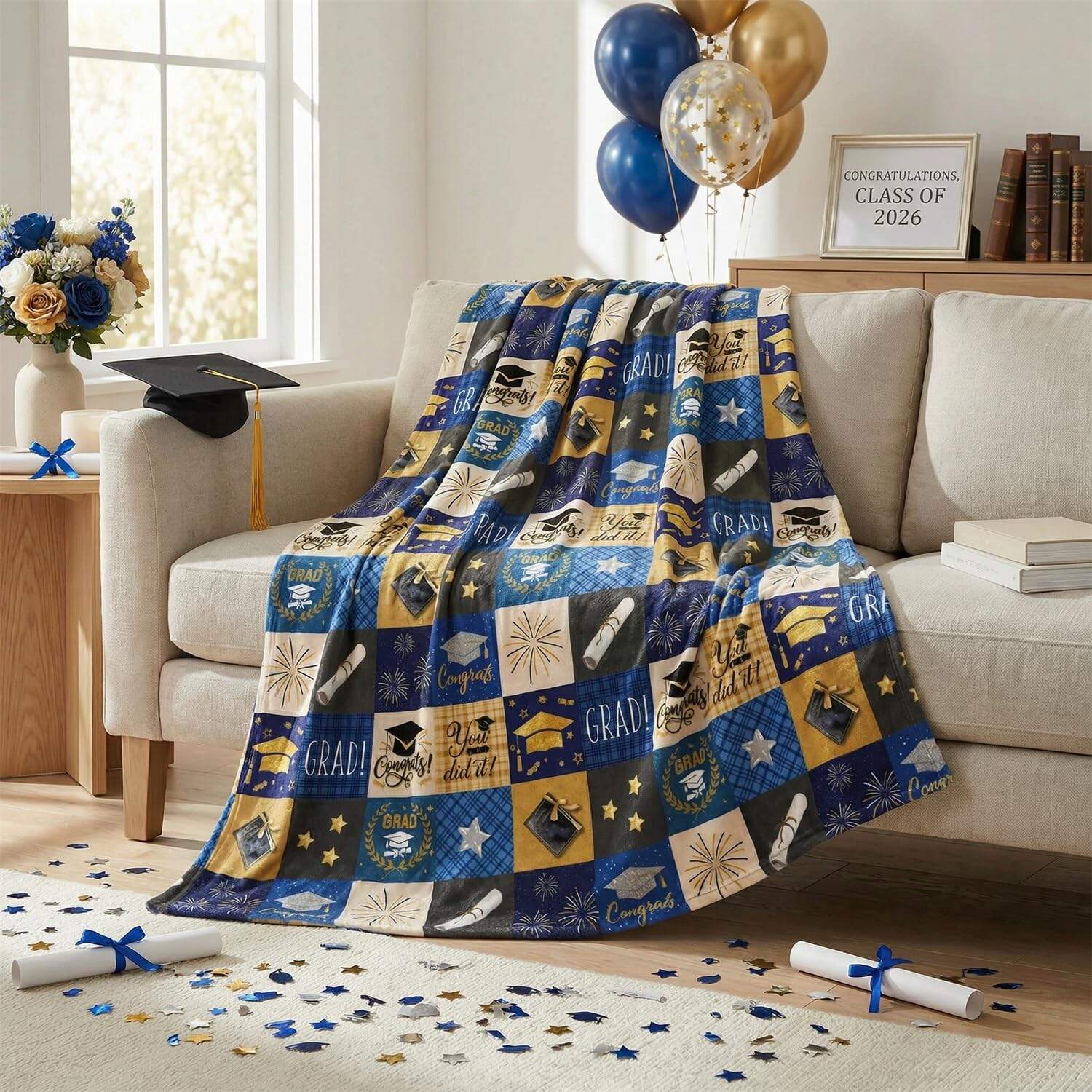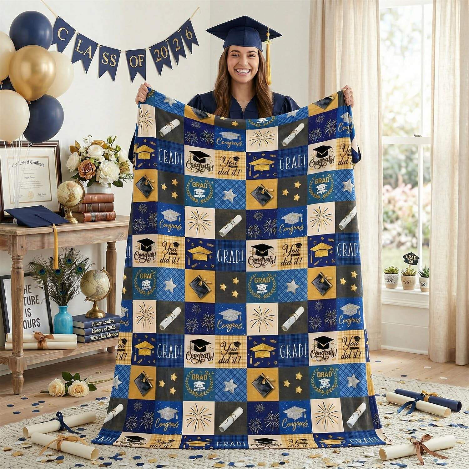 Oslavte absolventský ročník 2026 exkluzivní flanelovou přikrývkou na promoci! Stylový modro-zlatý kusový potisk je zdoben čepicemi na promoci, diplomovými listy a oslavnými motivy – je to dojemný způsob, jak uctít tento milníkový okamžik.
