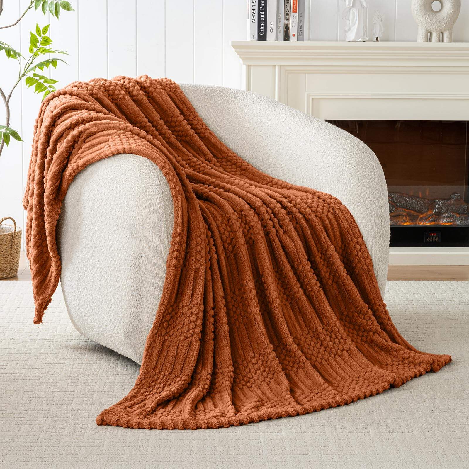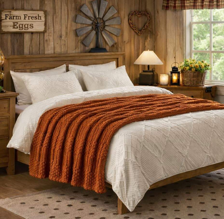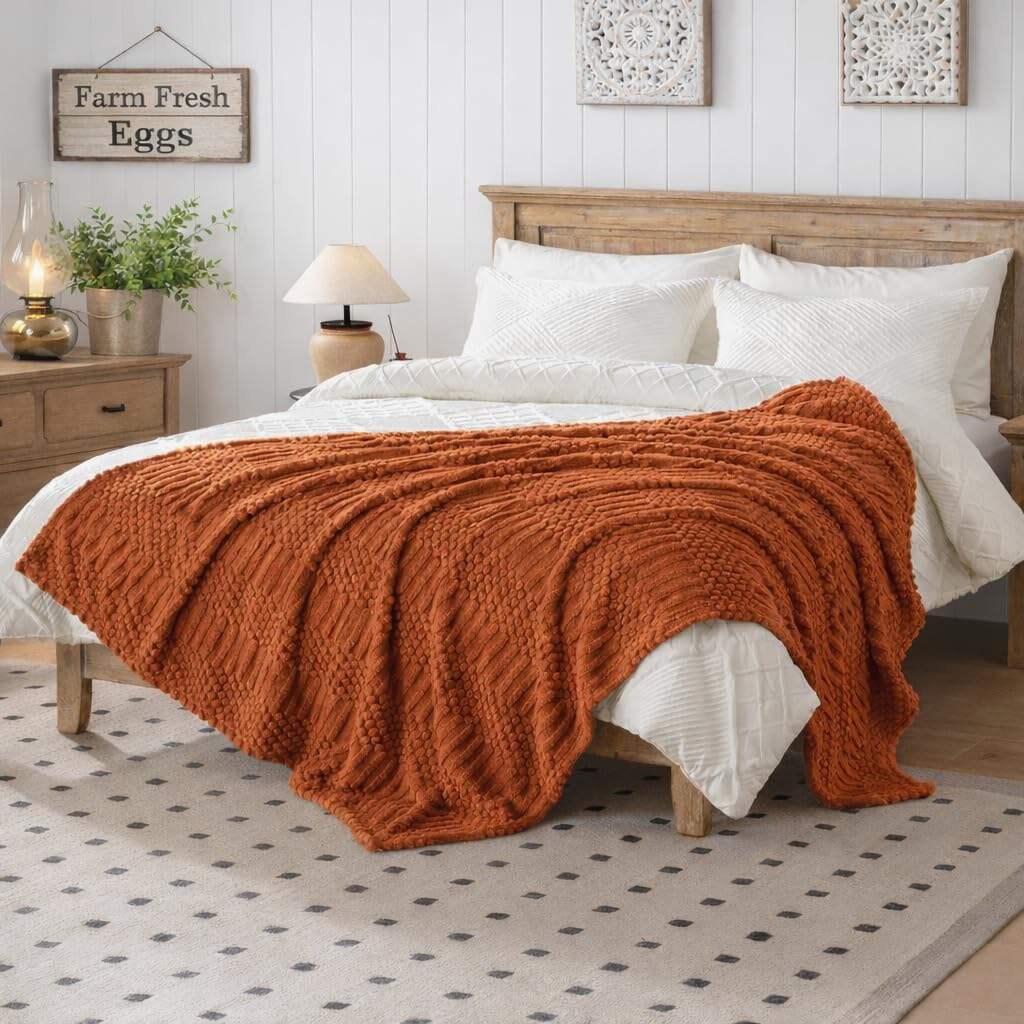 Le motif unique en relief composé de points bombés et de rayures verticales ajoute un charme tactile à chaque pièce, tandis que la teinte riche d’orange brûlé s’accorde parfaitement avec les styles rustique, bohème, ferme moderne et même minimaliste. Jetez-le sur votre canapé, superposez-le sur votre lit ou drapez-le sur un fauteuil : il transforme n’importe quel coin en un petit nid douillet et photogénique pour Instagram !