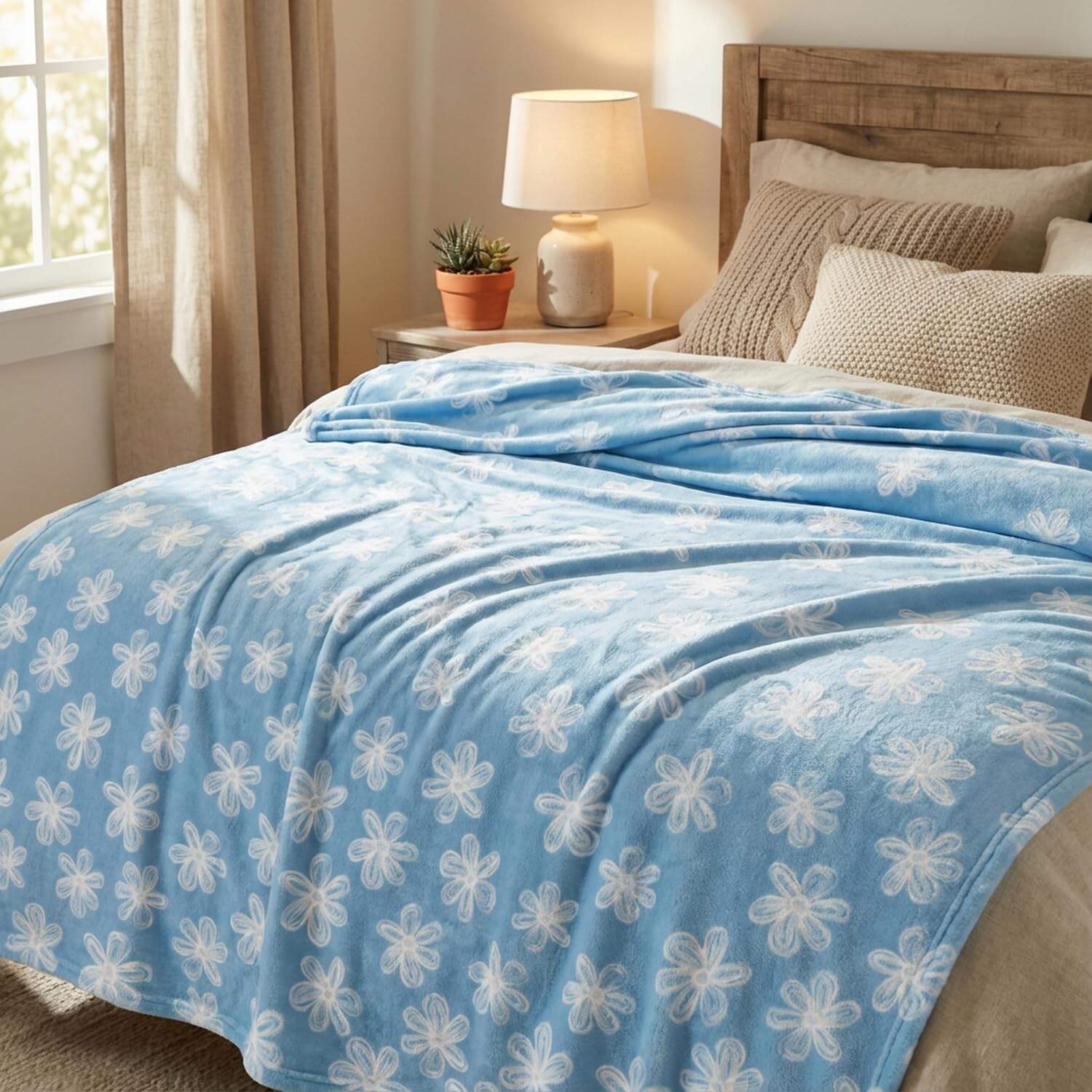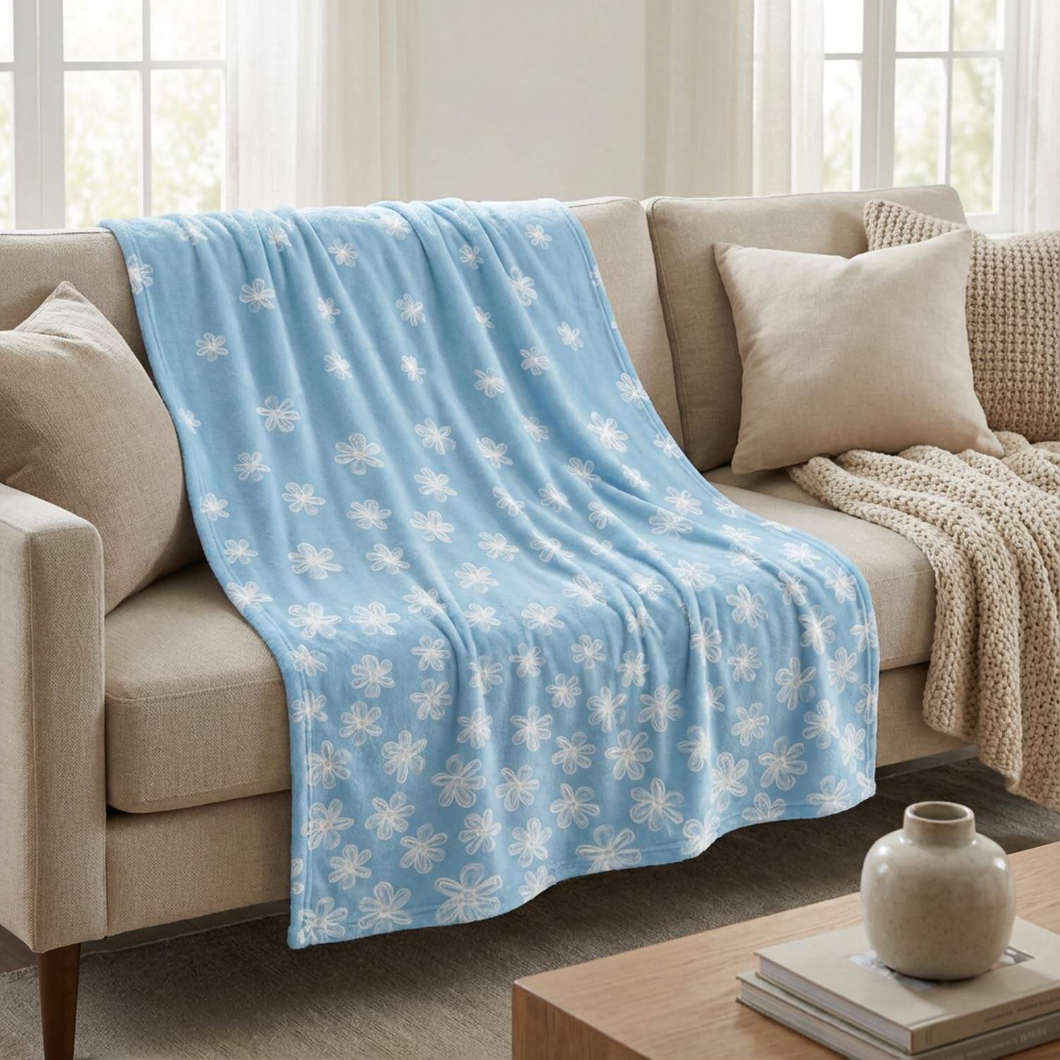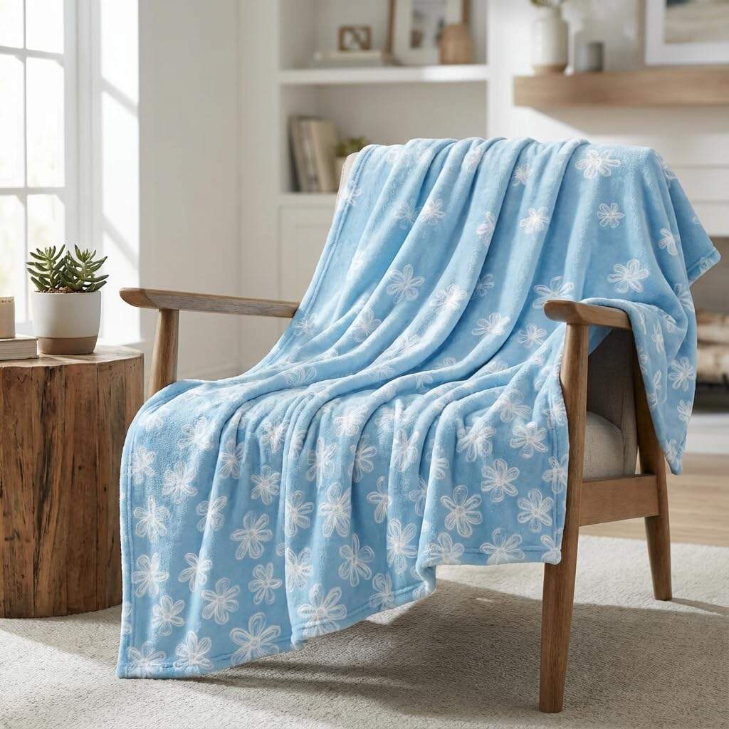 A finom fehér hagymáscserepek minta lágy, világoskék alapon kis házias (cottagecore), bohó vagy minimalista varázslatot kölcsönöz bármely térnek. Terítse a kanapéjára, rétegezze az ágyára, vagy dobja át egy karosszék karfájára – ez a takaró nemcsak praktikus, hanem stílusos díszítőelem is, amely emeli otthona esztétikáját.